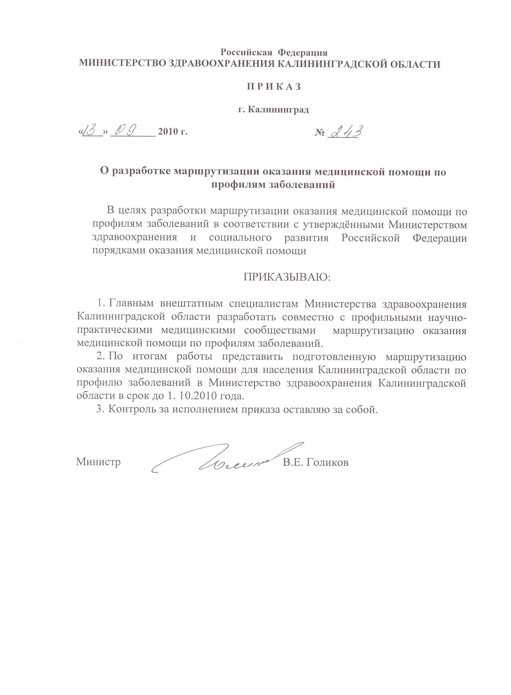 Приказ Министерства здравоохранения Калининградской области от 13 сентября 2010 г. N 243 Опубликован 14.09.2010 |