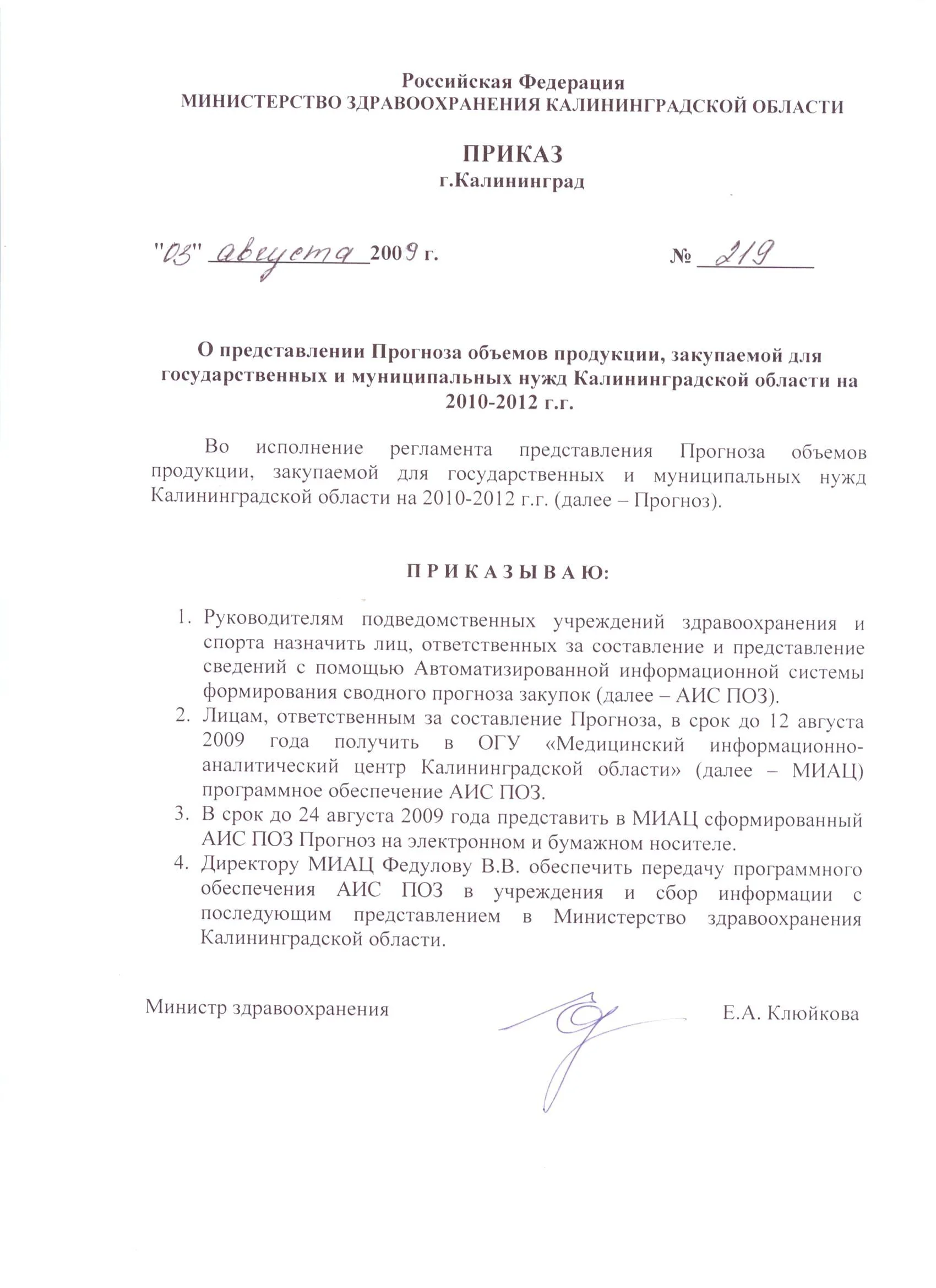 Приказ Министерства здравоохранения Калининградской области от 3 августа 2009 г. №219 Опубликован 07.08.2009 |